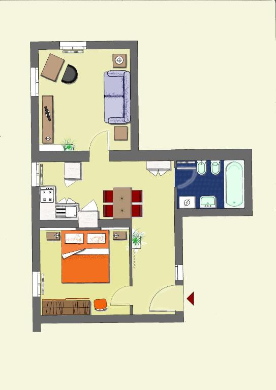 L'alloggio presenta un angolo cottura con lavastoviglie e forno a microonde, e un bagno privato con vasca, asciugacapelli e bidet.