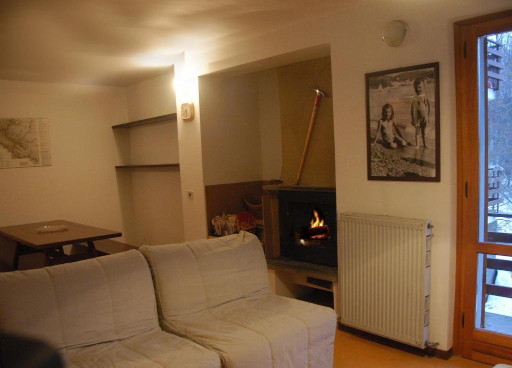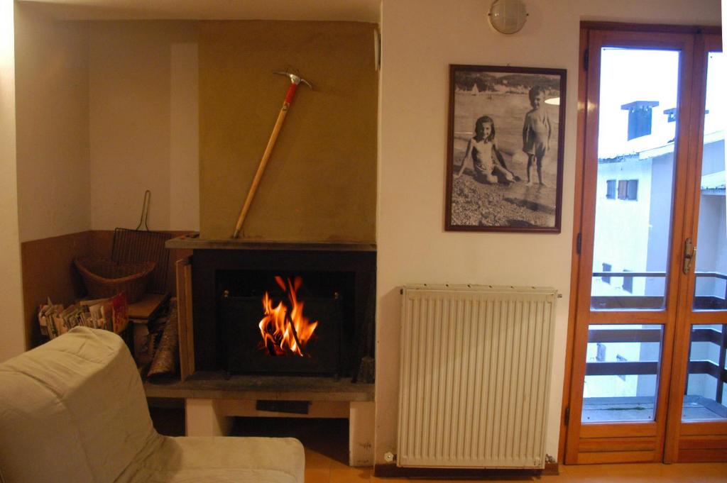 Con viste sulle montagne, l'appartamento è dotato di cucina, zona pranzo, TV, caminetto e divano.