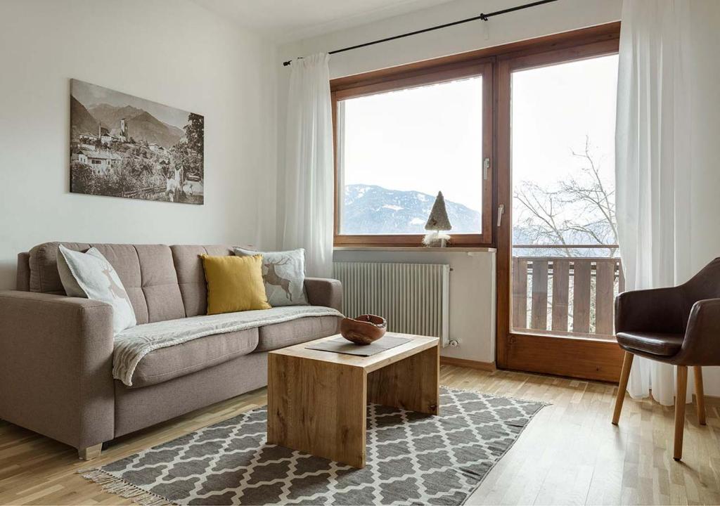 Entspannte Urlaubstage hoch über Meran Unsere Ferienwohnung liegt in traumhafter Lage am Sonnenplateau von Schenna über der Kurstadt Meran, wenige Gehminuten vom Dorfkern entfernt. Das neu renovierte Domizil bietet auf rund 66 m² Platz für 2-5 Personen. Für großen Wohnkomfort sorgen neben einem Dreibett-Zimmer und einem Wohnzimmer mit Schlafsofa (Federkernmatratze) auch die gut ausgestattete Essküche, ein luxuriöses Bad mit Regendusche, ein großzügiger Balkon mit Panorama-Blick auf den Naturpark Texelgruppe und unser liebevoll gepflegter Garten. Frühstücksbuffet und Schwimmbad mit Wellnessbereich können gegen Bezahlung im benachbarten Hotel „Gutenberg“ genutzt werden.