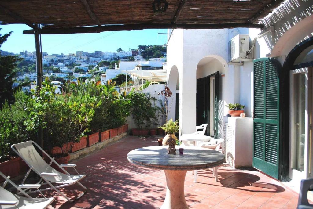 Capri Terrace è una casa elegante e spaziosa, tipica struttura dell’isola di Capri,immersa nel verde con pergolato e vista sul mare di Marina Grande e sul Golfo di Napoli. L’ampia terrazza all’aperto è ideale per rilassarsi ammirando il panorama che la posizione della casa offre oppure per degustare prodotti tipici locali accompagnati dall’odore della brezza marina. La casa gode di un’ottima posizione, centrale, comoda per raggiungere le spiagge più note e grandi dell’isola a pochi minuti dalla famosa piazzetta dove è possibile vivere l’atmosfera caprese.La casa si compone di un’ampia camera da letto, una cameretta con letto singolo, soggiorno con due divani letto apribili (2 posti ognuno), cucina , bagno con doccia. Terrazza attrezzata con tavolo sedie, sdraio e doccia all’aperto. Ogni camera dispone di una portafinestra con affaccio sulla terrazza. La casa dispone di 5 posti letto comodi ma è possibile ospitare fino a 7 persone con una sistemazione che prevede l’utilizzo del secondo divano letto situato nel soggiorno.