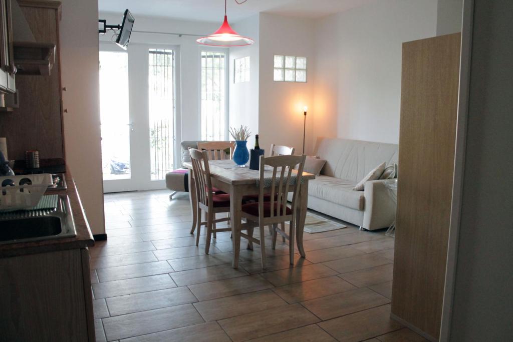 L’appartamento presenta una camera da letto, bagno, lenzuola, asciugamani, TV satellitare a schermo piatto, cucina completamente attrezzata, zona pranzo e un patio con vista sul giardino.