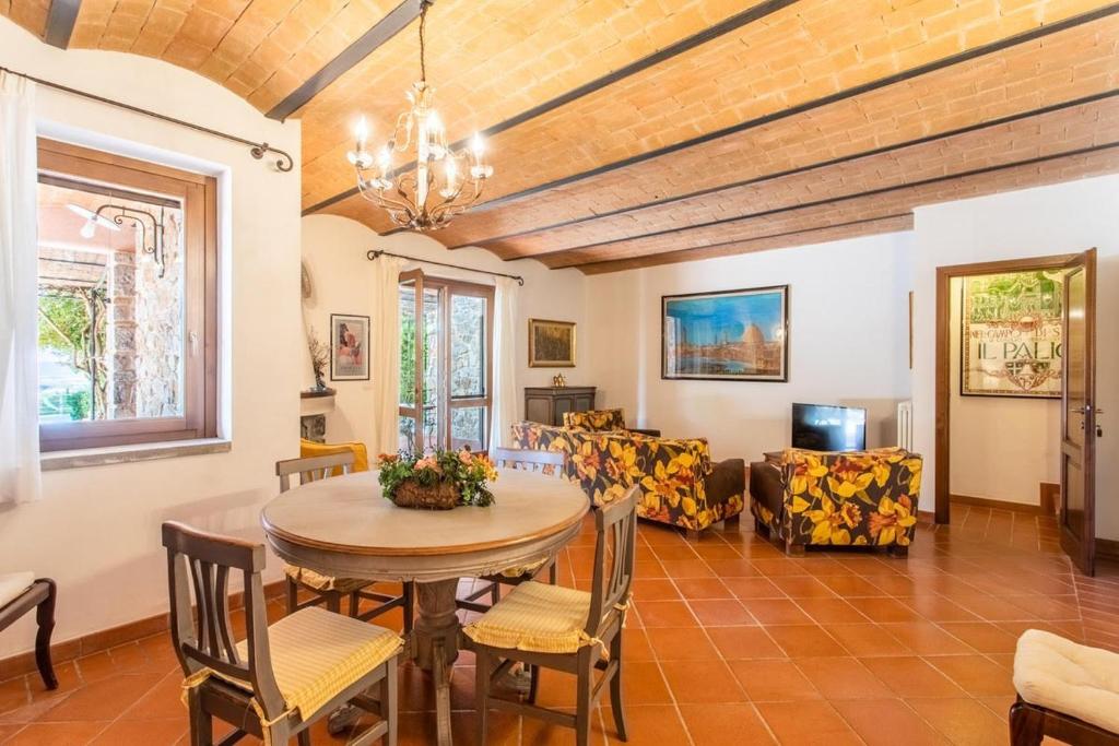 Situata a Montemerano, la Casa grande offre una terrazza. Questa struttura con vista sulla città sorge a 31 km da Orbetello. L'appartamento è dotato d