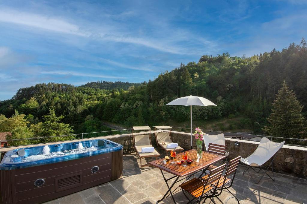 La terrazza si affaccia sulla Valle del Casentino e presenta una vasca idromassaggio, alcuni lettini e una zona pranzo all'aperto con barbecue, tavolo e sedie. Inoltre come ospiti della Torre Medievale Lungarno avrete la possibilità di prenotare i servizi di uno chef privato e all'arrivo sarete accolti con una torta di benvenuto.