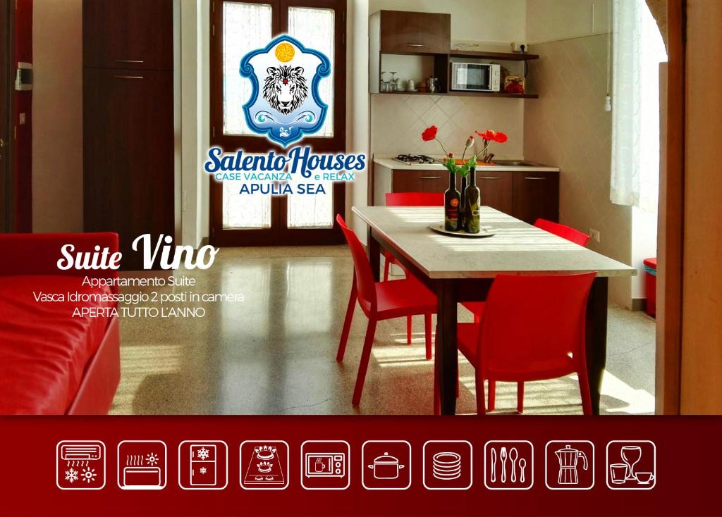 Splendido casale antico in campagna, offre ai suoi ospiti un meraviglioso soggiorno, relax e tranquillità. Salento Houses Superior è immerso in un grande villaggio con area verde con grandi alberi di eucaliptus. A pochi passi ulivi secolari e alberi dai profumi mediterranei con la famosissima macchia mediterranea. Le meravigliose spiagge del Frascone, Parco marino, Sant'Isisdoro, Portoselvaggio, parco naturale, sono raggiungibili in macchina in pochi minuti. Il casale ha 2 livelli, il piano terra con 2 bilocali: "Girasole", "Grano”, un bilocale con vasca idromassaggio in camera "Smeraldo" e un monolocale " Tramonto" ristrutturati che si affacciano sul verde, completi di cucina, camera matrimoniale, divano letto matrimoniale, bagno anche per disabili con tutti i comfort. Nel primo piano sono disponibili 3 bilocali Superior: "Vino", "Crocus" e "Mare" sempre con cucina, camera matrimoniale, divano letto matrimoniale e comfort e con vasca idromassaggio Jacuzzi (in comunione) sul terrazzino. Tutti gli appartamenti sono climatizzati. A disposizione posti auto, doccia esterna e divanetti all'aperto.