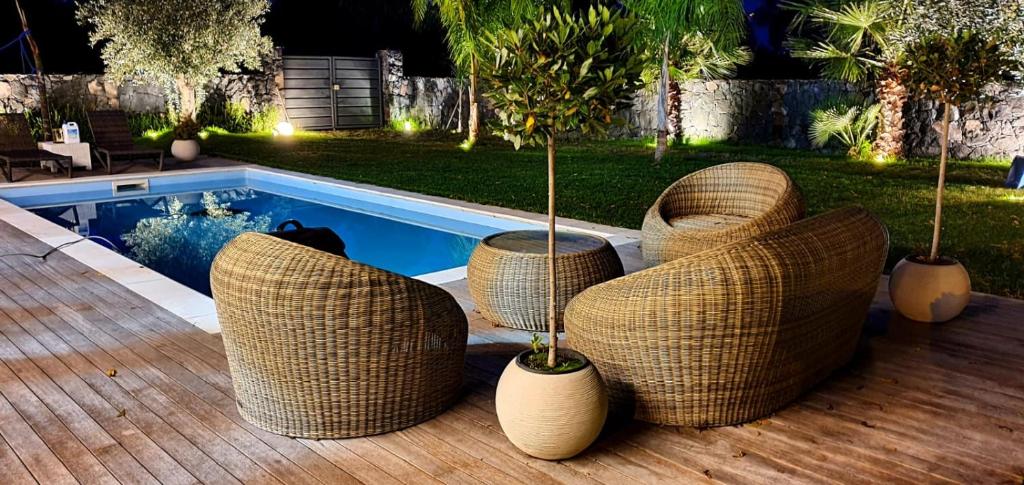La villa presenta 3 camere da letto, una TV a schermo piatto con canali satellitari, una cucina attrezzata con lavastoviglie e frigorifero, una lavatrice e 3 bagni con bidet. Per una maggiore comodità, la struttura fornisce asciugamani e lenzuola a un costo aggiuntivo.