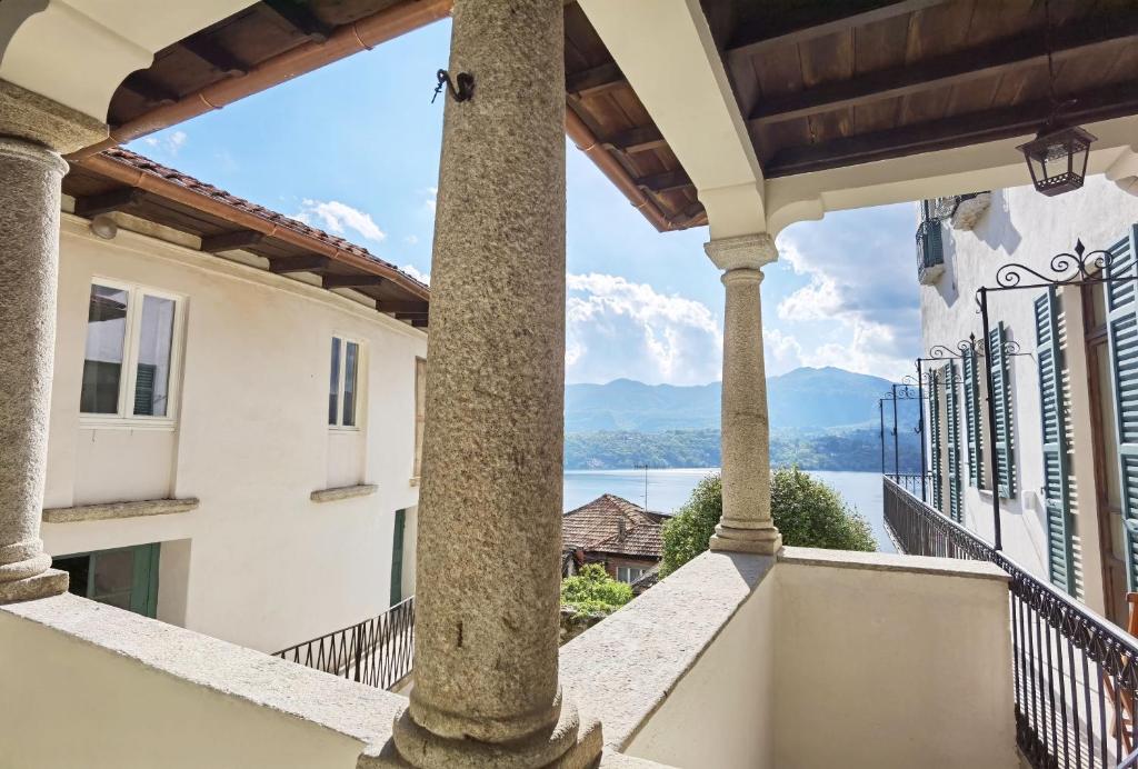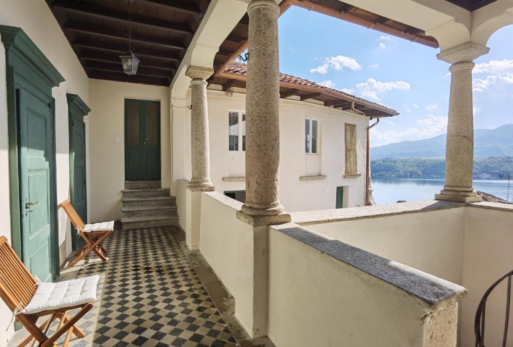 Set on the shores of Lake Orta, Villa Bonola is a baroque palace built by the painter Giorgio Bonola in 1679 and was renovated in 2020. The Villa belongs to the most important historical buildings of Lake Orta. It is surrounded by a garden with stunning views of the lake and Monte Rosa and from here you can do hikes with breathtaking views of the lake and the nature as well. The apartments are located in the main building and the two dependances. The main building preserve many baroque details like painted ceilings and venetian stucco. All accommodation features free and fast Wi-Fi, satellite TV with flat screen and a kitchen with dishwasher. You will also have a coffe machine, toaster, kettle and a shared washing machine. If you book the whole villa (except the museum rooms which are not bookable) there is space for 14 persons. Italian bed linen by Bassetti . There are outside sitting faciilities with lake view . The offered Casa Grande has 4 bedrooms, 4 bathrooms. 2 kitchens, small chimney room, dining room and library. The two sleeping rooms in the 2nd floor have A/C , the two in the first floor not but very thick protecting walls. The elevator reaches the 1st floor only.